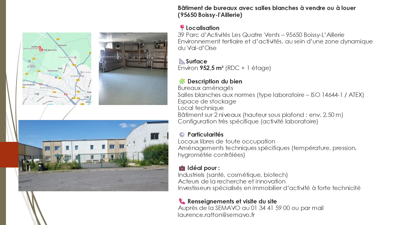 Produits à vendre ou à louer Bâtiment de bureaux avec salles blanches à vendre ou à louer (95650 Boissy-L’Aillerie) Produits à vendre Produits à louer